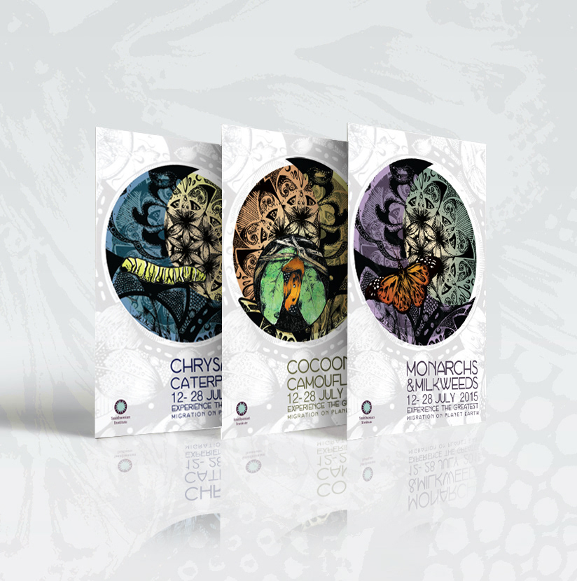 Illustrated poster series concept for a lecture on the life cycle of monarch butterflies.